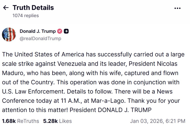 도널드 트럼프 미국 대통령은 3일(현지 시간) 소셜미디어 트루스소셜을 통해 “미국은 베네수엘라와 그 지도자인 니콜라스 마두로 대통령에 대한 대규모 공격을 성공적으로 수행했다”고 밝혔다. 이어 그는 “마두로 대통령과 그의 부인은 체포되어 국외로 이송됐다”고 했다.