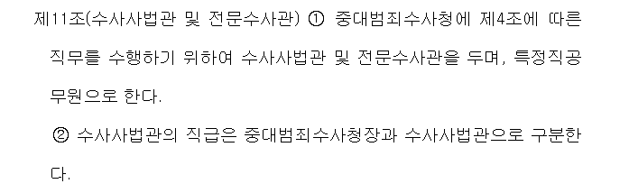 법안 ‘11조(수사사법관 및 전문수사관)’를 보면 중대범죄수사청에 직무를 수행하기 위해 수사사법관 및 1급부터 9급까지의 전문수사관을 두고 특정직공무원으로 한다고 돼 있다. 수사사법관과 전문수사관, 이게 바로 중수청 조직 이원화 문제다. ‘수사사법관’이라는 새로운 직책명은 어디서 유래한 이름인지는 알 수 없지만 변호사 자격을 조건으로 한다. 그래서 ‘검사’와 이름만 다른 '검사'라는 주장과 의심이 계속해서 나오고 있다.